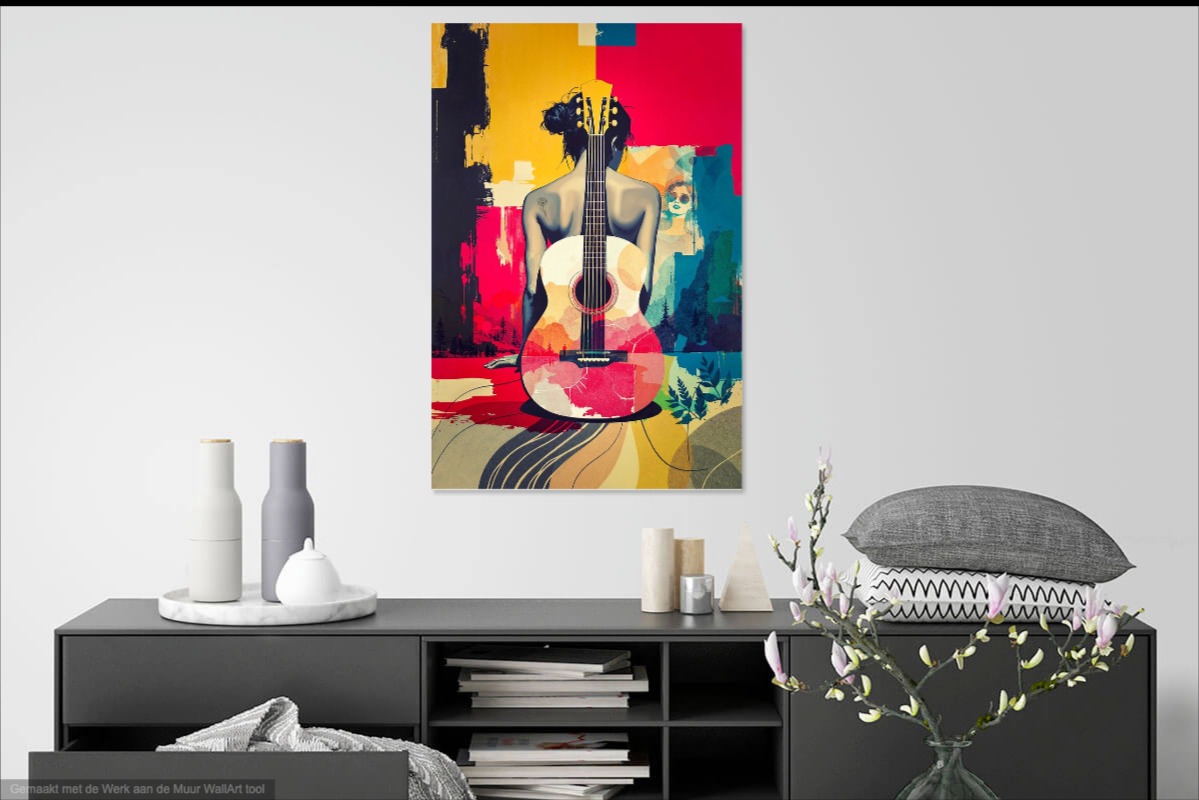 In Summer Strings vang ik de sfeer van vrijheid, reizen en muziek in een kleurrijk pop art werk. Een mixed media compositie waarin vrouw, gitaar en landschap samensmelten tot een zomerse ode aan creativiteit en zelfexpressie.