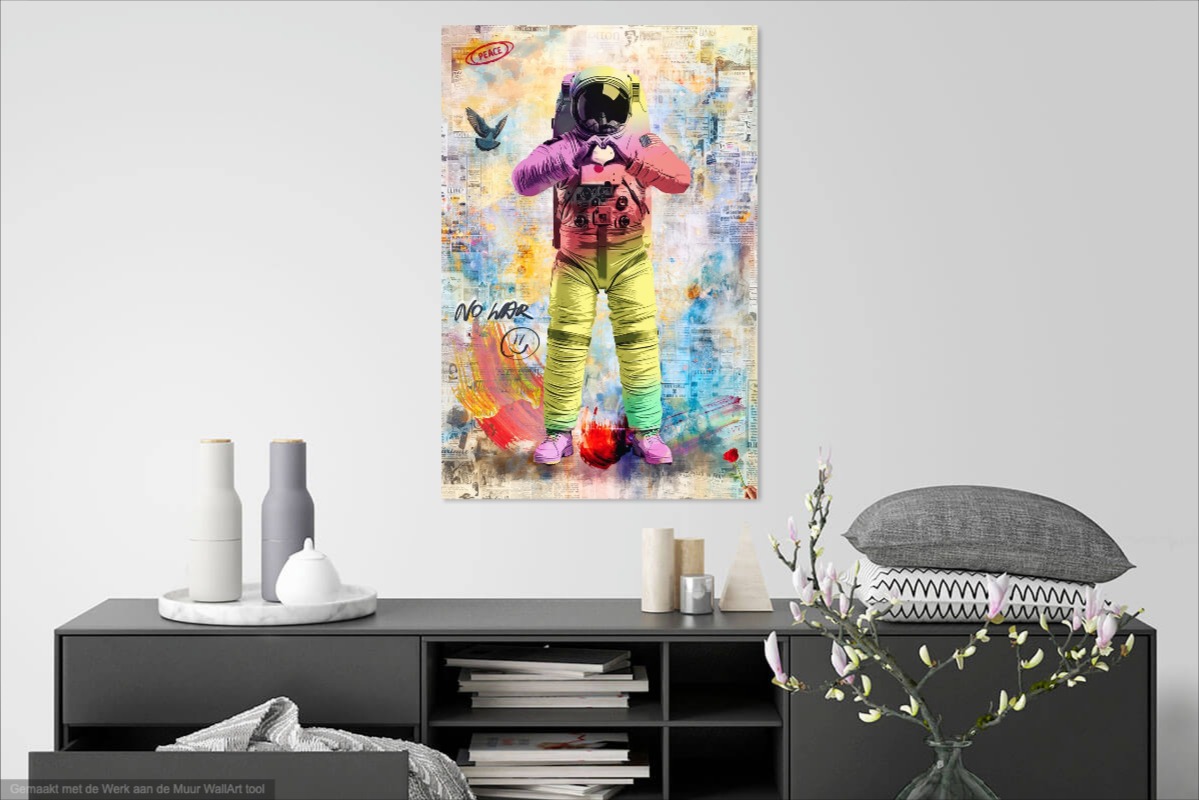 Een kleurrijk maar krachtig statement piece waarin ik pop-art, street art en digitale zeefdruk combineer. Een neon astronaut vormt een hart met zijn handen terwijl een duif en een subtiele wereldkaart verwijzen naar hoop, liefde en vrede. Een werk dat niet alleen gezien wil worden, maar vooral gevoeld.