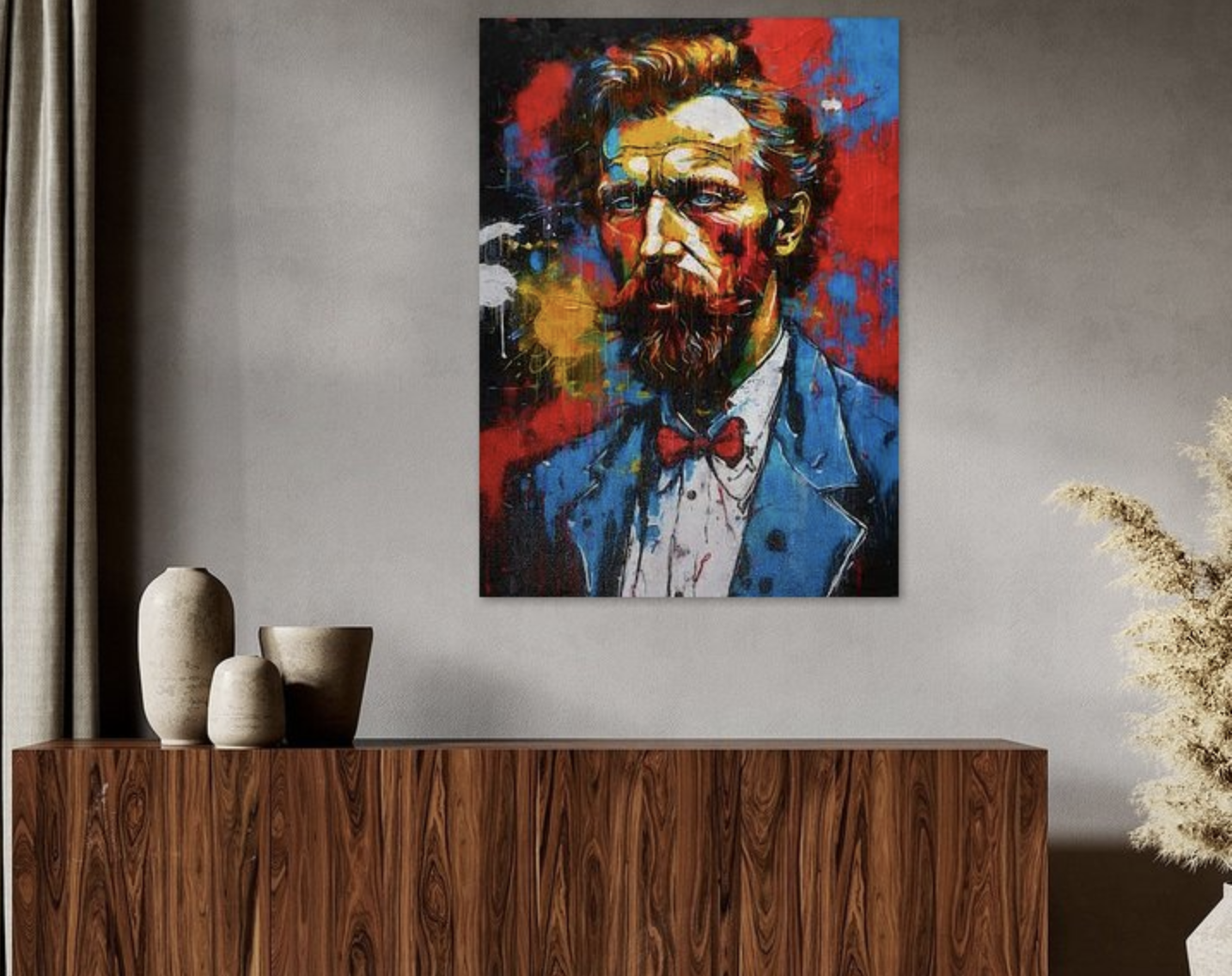 Een krachtige moderne interpretatie van het klassieke portret in levendige pop art kleuren. Dit kleurrijke werk combineert traditie met eigentijdse expressie en is een blikvanger in elk modern interieur.